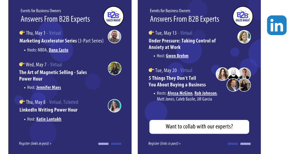 Feature in LinkedIn - Be included in B2BSalesMagicâs monthly post about upcoming B2B events, see past example: The average CTR is 15%.